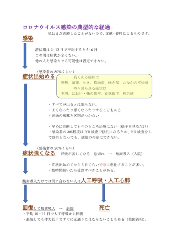 更に、その症状が出て息苦しさや熱が出た人の5人に1人が重症化して何もしなければ助かる見込みが無くなるというところである。それも驚くような急激な症状の悪化で死を迎えるという。さっきまで普通に話しをしていた人が急に生命維持装置が必要な状態になるのだ。